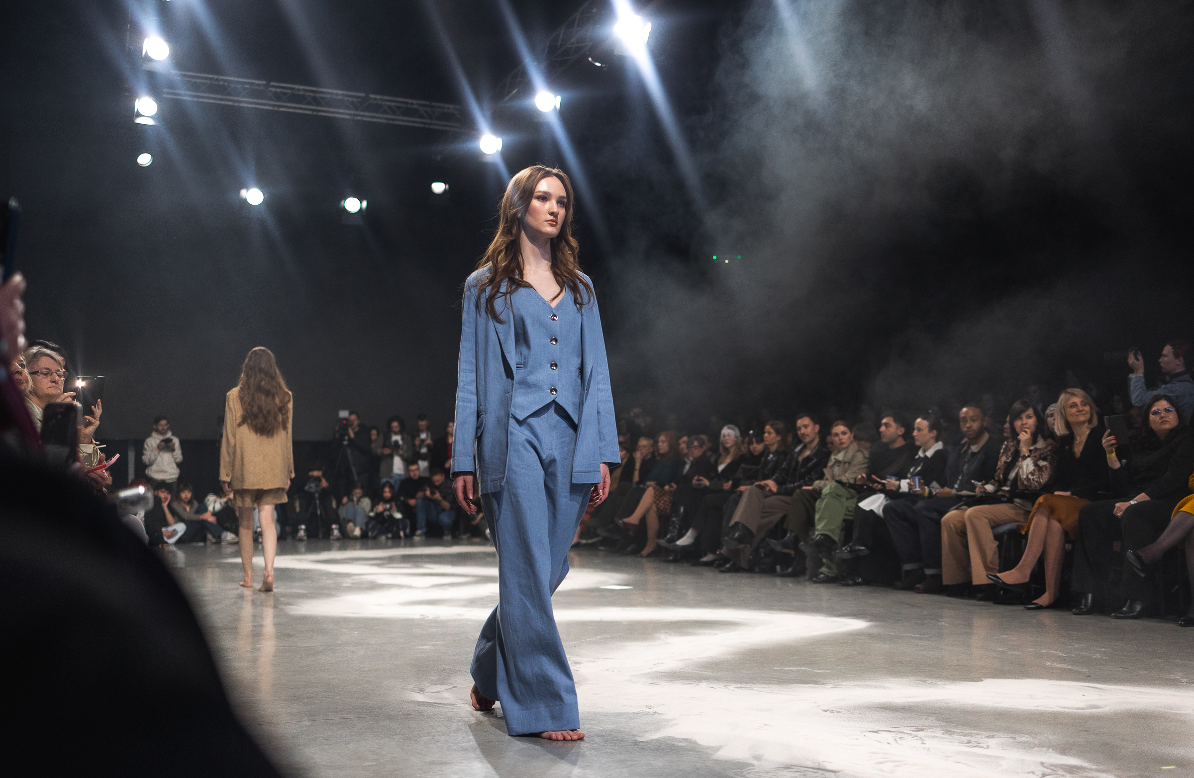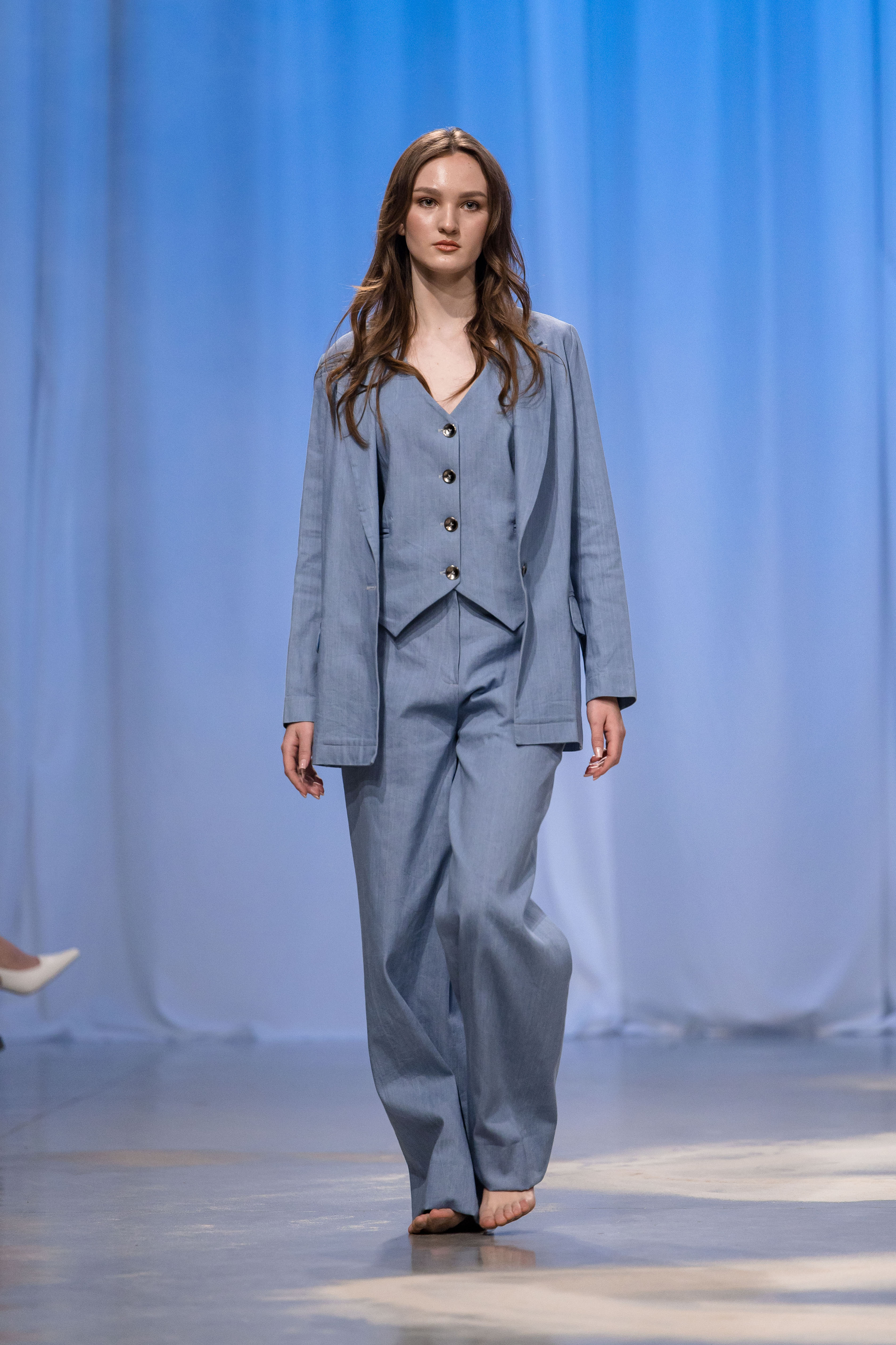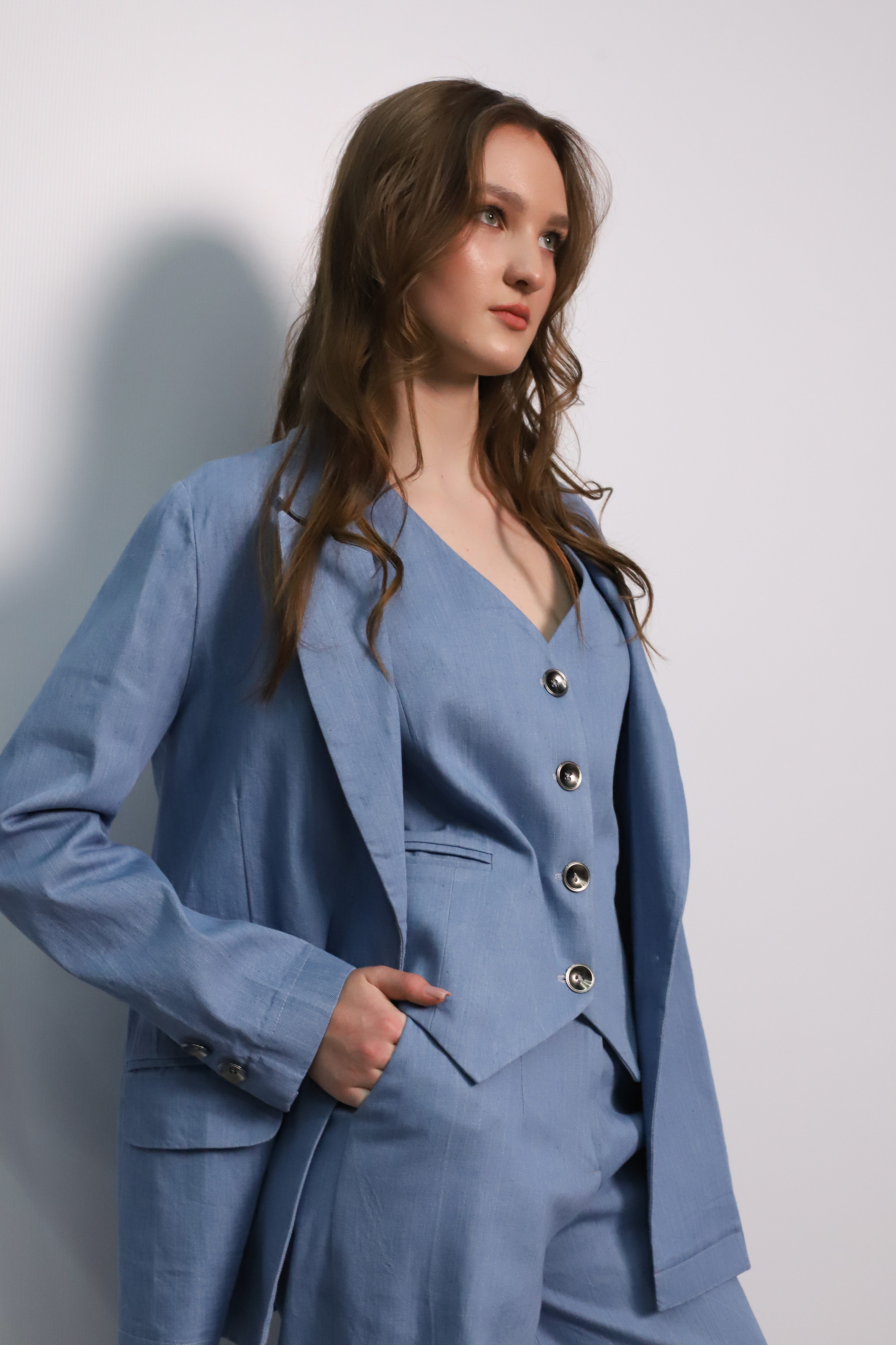 Denim suit consisting of a straight jacket, wide trousers and a vest with metal buttons