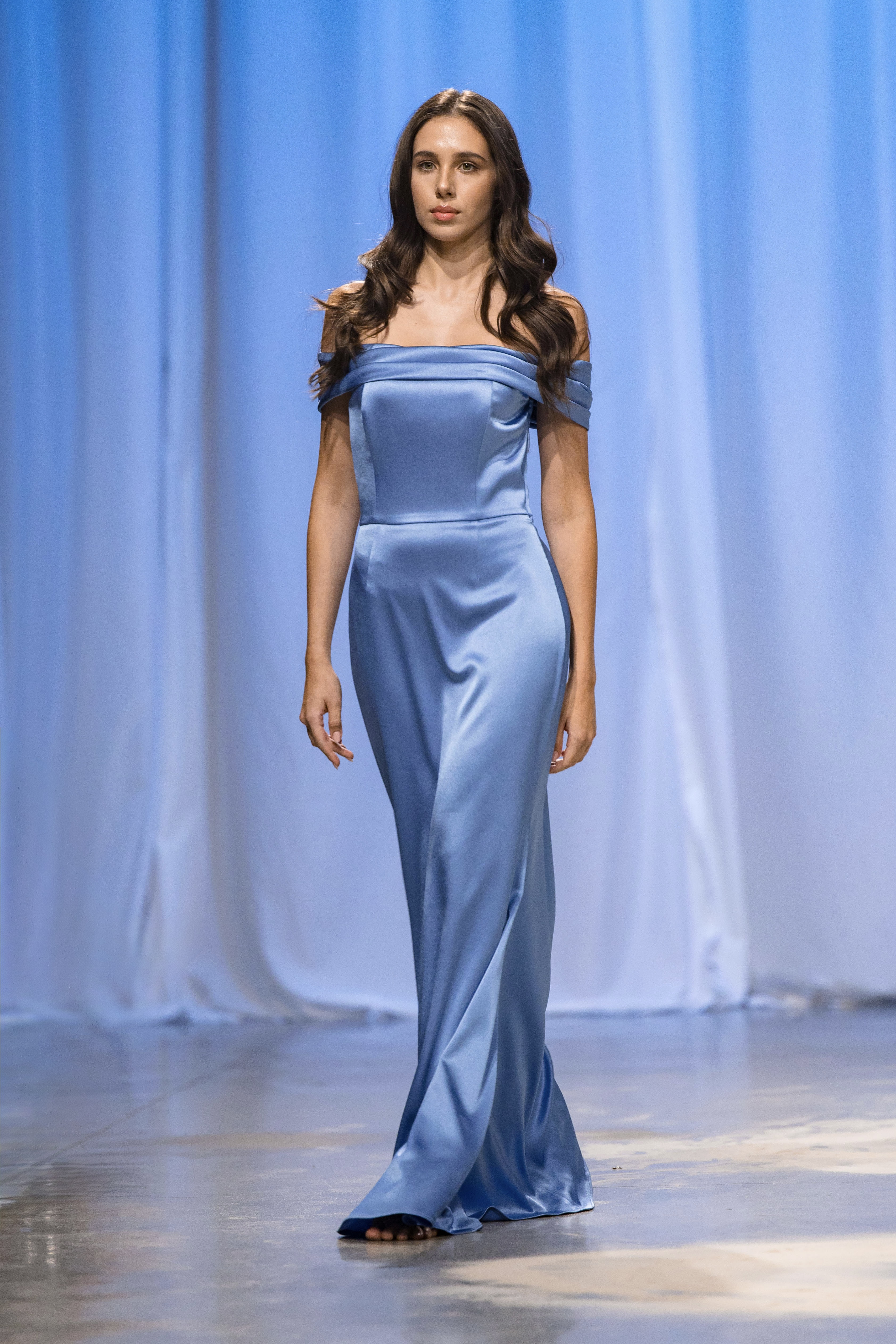 Mermaid-cut maxi dress with wave pleats around the bare shoulders